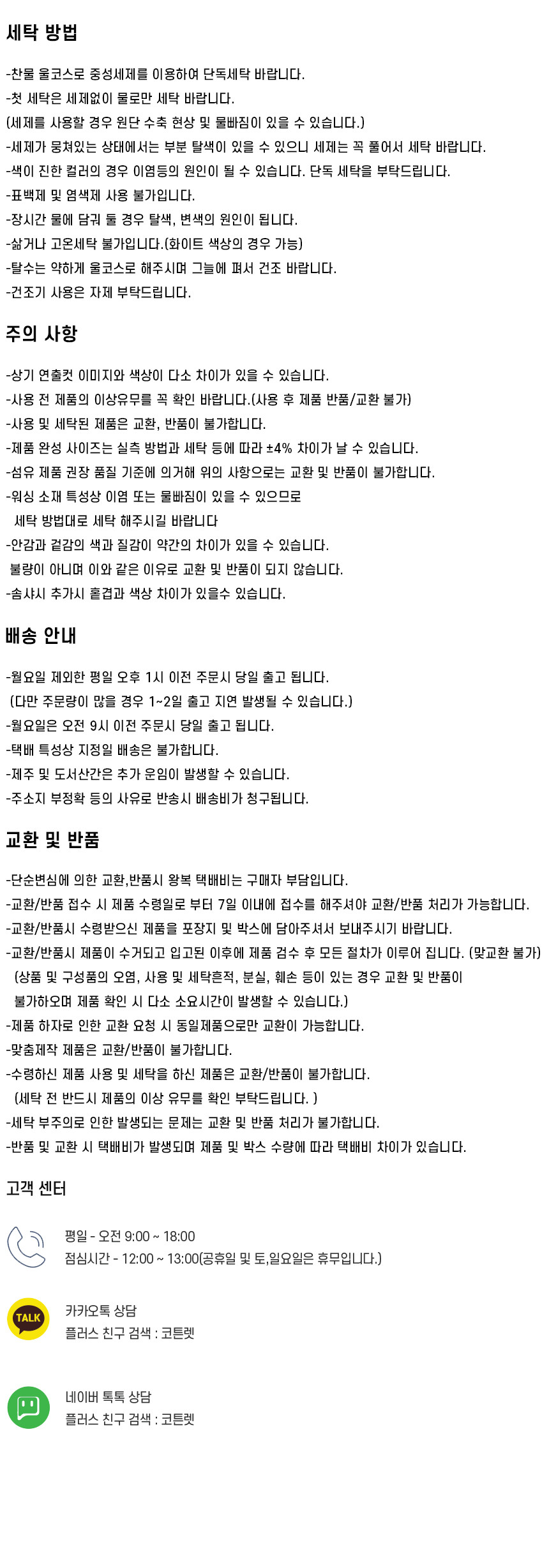 - 수령하신 제품 사용 및 세탁 이후의 제품은 반품 및 교환이 불가합니다.