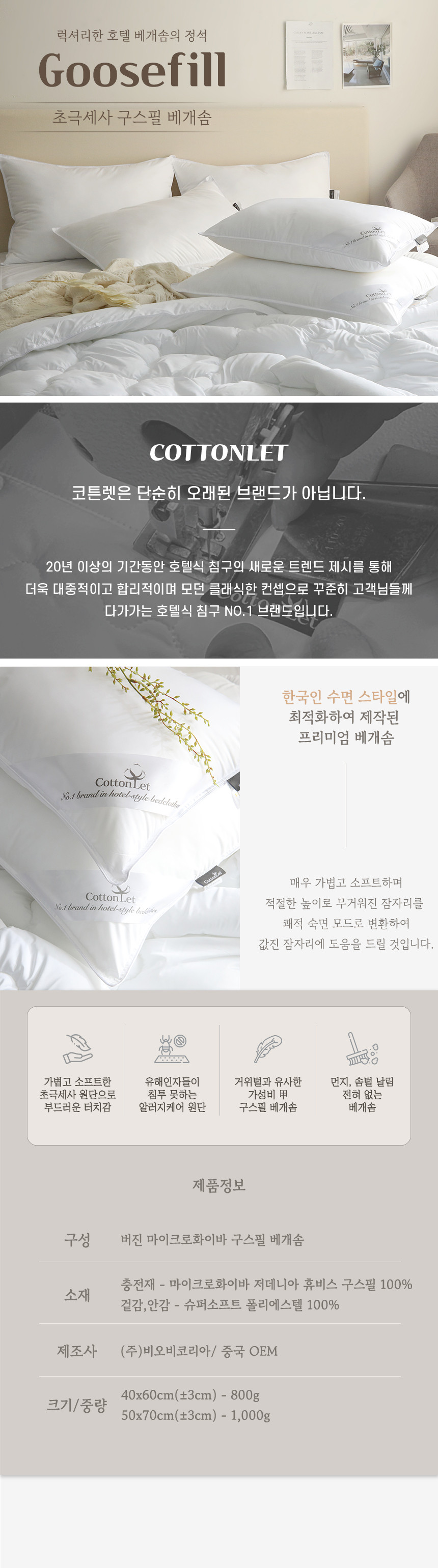 코튼렛 버진 마이크로화이바 구스필 베개솜