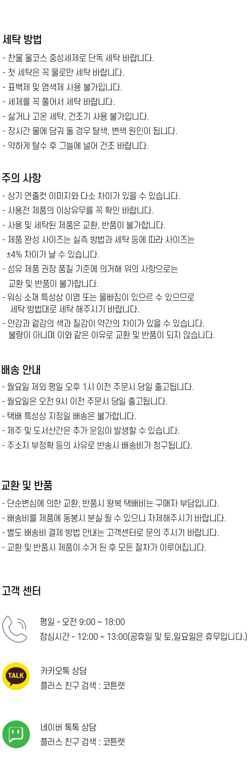 - 수령하신 제품 사용 및 세탁 이후의 제품은 반품 및 교환이 불가합니다.